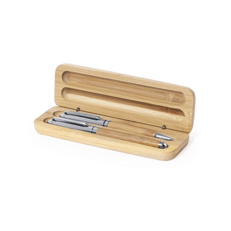 Nature line ball pen and roller set. Made in a combination of bamboo and metal to promote the use of natural raw materials and reduce pollutant emissions. Ball pen with twist mechanism in blue ink. Roller with cap, gel ink in blue and jumbo refill. Presented in an individual bamboo case. (neutral color)