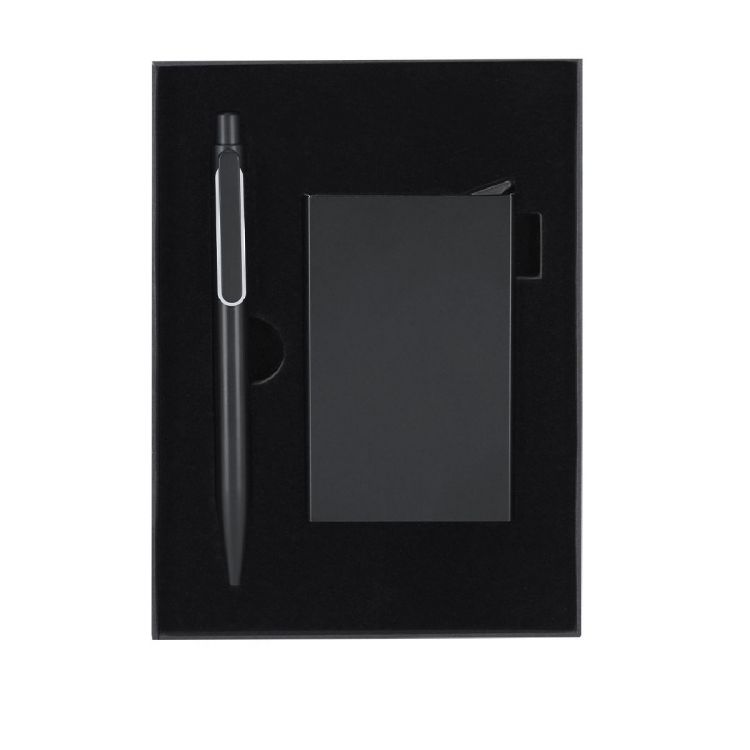 Set of pen and cardholder made from Recycled Aluminum.The set includes:- Matte black ballpoint pen made from Recycled Aluminum with a push mechanism, clip, and decorative metal element.- Cardholder in black made from Recycled Aluminum suitable for 6 RFID cards, with a push mechanism to extract the cards.Both have the Recycled Aluminum logo engraved and are presented in an elegant black box with an interior insert.Recycled Aluminum is a material with almost infinite recycling possibilities, without losing its original properties and consuming less energy in this process.GRS Certification (Global Recycled Standard), which guarantees the recycled origin of the material used to manufacture the product. (black color)
