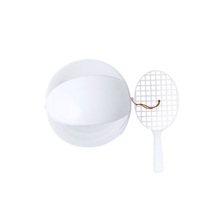 Fun set of racket and ball in a combination of white and translucent colors, attached by an elastic band. With inflation valve and presented in a recycled bag. (white color)