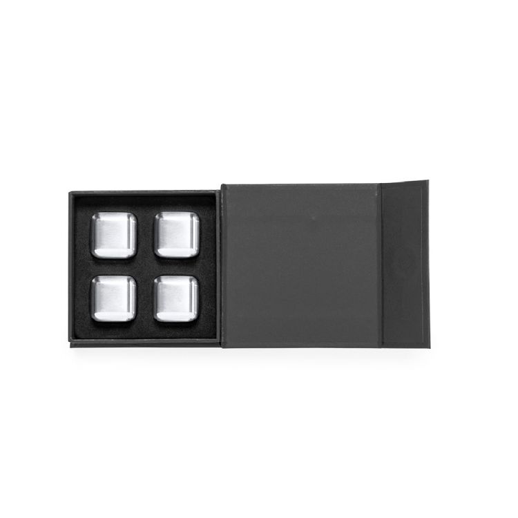 Set of 4 reusable ice cubes. Made of stainless steel, keeping the drink cold without altering its properties by not diluting its content in water, as well as maintaining its original flavour. Presented in an elegant black case with inside die cut. (neutral color)