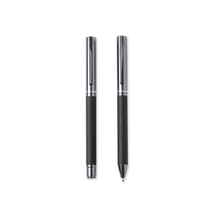 Antonio Miró ball pen and roller pen set. Including: Metal ball pen with matte black barrel. Chrome plated fittings and cap with brand logo. Jumbo cartridge and blue ink.Metal roller pen with matte black barrel. Chrome plated fittings and cap with brand logo. Jumbo cartridge and blue ink.Presented in an elegant and resistant individual black case with Antonio Miro logo. Magnetic closure and matching protective sleeve. (black color)