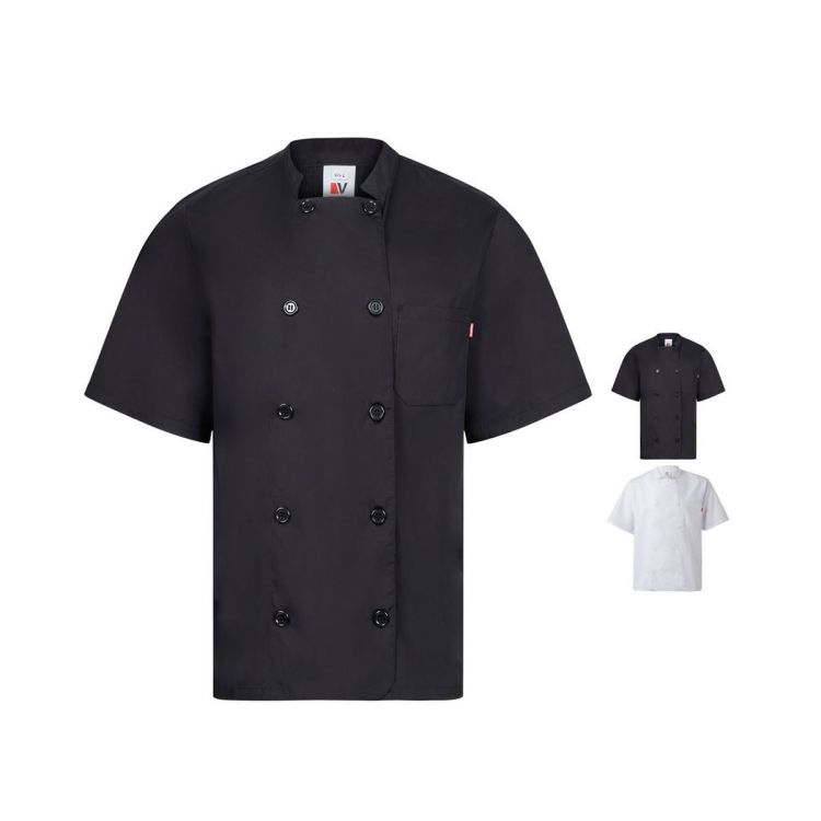 Short-sleeved poplin (110g/m²) kitchen jacket in cotton (35%) and polyester (65%). With double button fastening system and 1 chest pocket