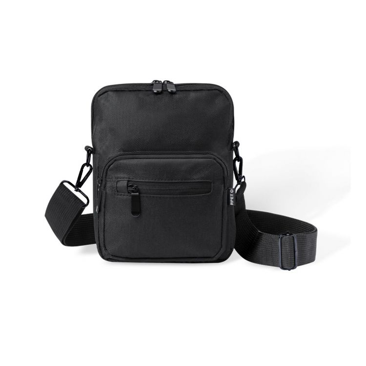 Shoulder bag made of RPET 600D polyester, with a central zipped pocket and double puller, and two front compartments with quick access and zipped closure. Equipped with an adjustable strap for comfort and a RPET label. Presented individually in a recycled bag. (black color)