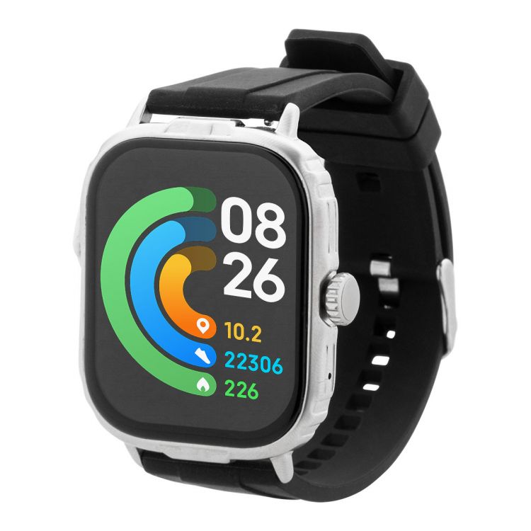 Multifunctional wireless smart watch in metal housing with 2,01" TFT touch screen, 210 mAh rechargeable battery and silicone strap. It has several health monitoring and smart features, such as heart rate, blood pressure and oxygen monitor besides many others. Can be connected to smartphones with a free app available for iOS and Android. Including magnetic USB charger cable. IP65 water resistant, in black color