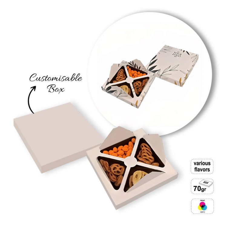 Pack of mixed snacks (70 g): mini pretzels, banana chips and peanuts with crunchy shells. Packaging: paper box with opening at the top, fully customizable (paper finish: white or kraft, to be chosen when ordering). Minimum shelf life - 6 months.