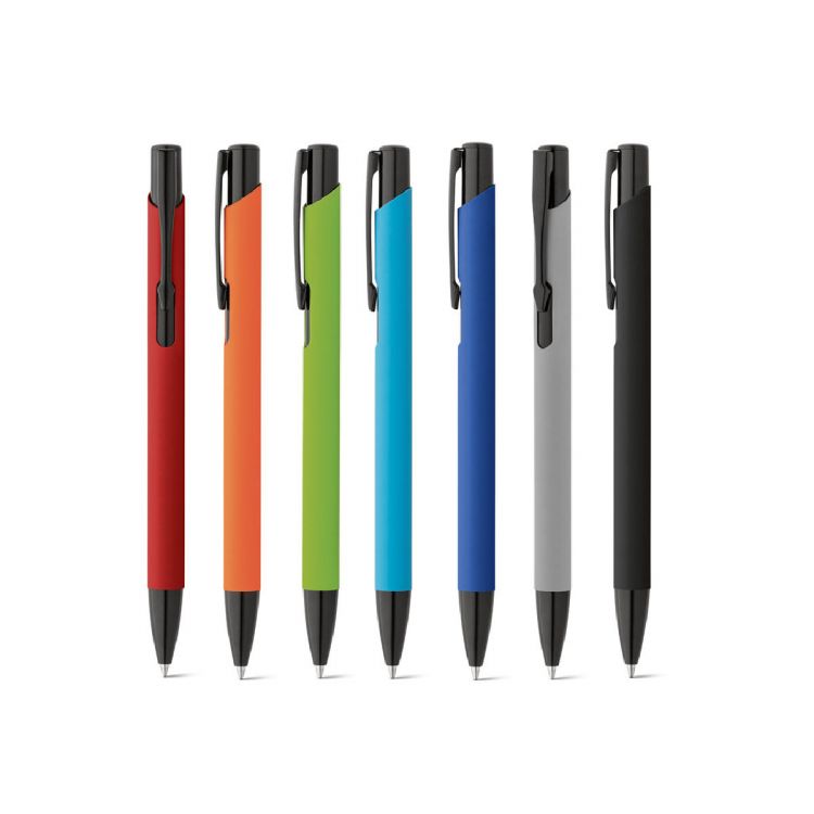 Aluminium ball pen with coloured body and rubber finish. Blue ink
