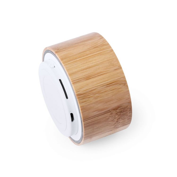 Compact speaker in bamboo. Bluetooth® connectivity and 3W. Hands-free function, FM radio, including slot for micro SD card, non-slip base and rechargeable via USB cable -included-. Presented in an attractive design box.