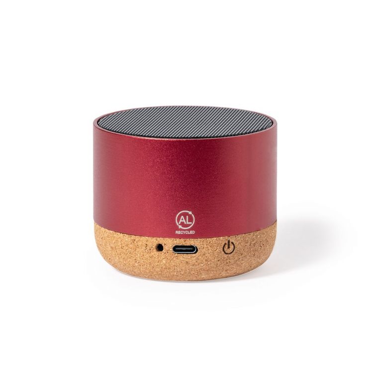 Speaker made in eco combination of recycled aluminium casing and natural cork base. With Bluetooth® connection and 3W power. 300mAh lithium battery. Includes recycled aluminium logo. Presented in an individual kraft design box. Instruction manual available in English and Spanish.Recycled aluminum has its origin in the almost infinite reuse of one of the materials with the greatest recyclability potential, keeping the quality of the resulting product. This feature turns it into an eco-friendly material of recycled origin, easily recyclable. Besides, new material and resources can be obtained from treatment and waste processes, consuming less energy among others sustainable factors.GRS Certification (Global Recycled Standard), which guarantees the recycled origin of the material used to manufacture the product.