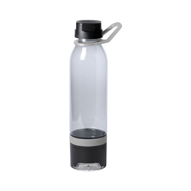 Plastic multifunction sport bottle with cooling towel (390 g/m²) in the bottom compartment and pull-out mobile phone holder. In gift box. 650 ml. Not suitable for carbonated drinks.