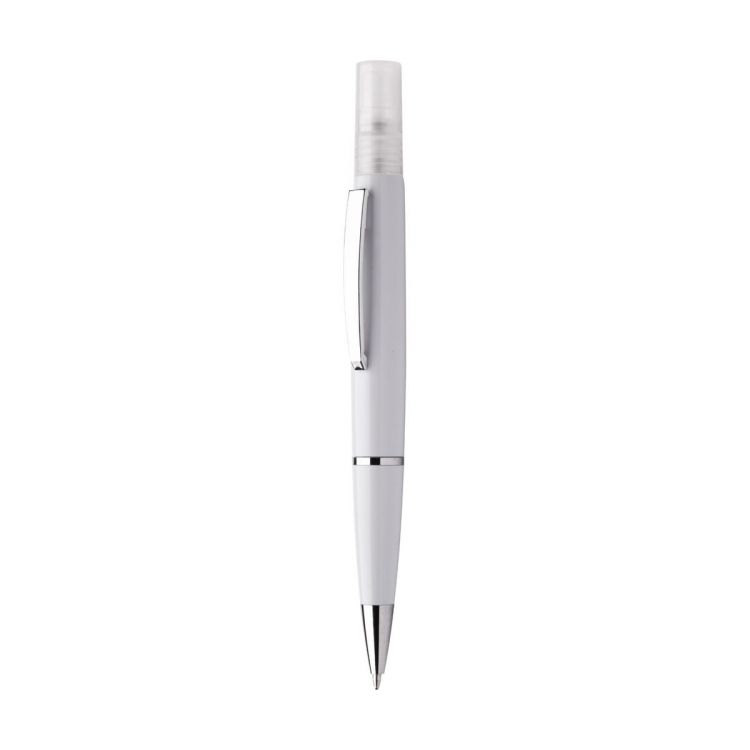 Plastic ballpoint pen with blue refill and sanitizer spray on top. Capacity: 3 ml. Delivered without sanitizer liquid, in white color
