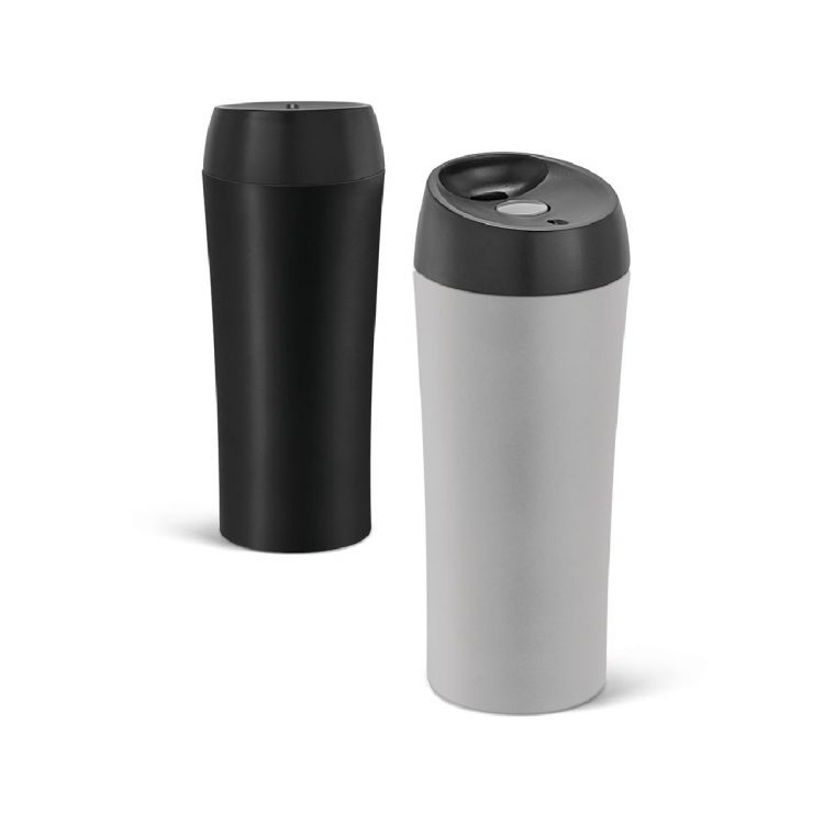 Double walled stainless steel and PP travel cup. Anti-spill lid and non-slip at the base. Volume-capacity of 470 mL. Supplied in a gift box