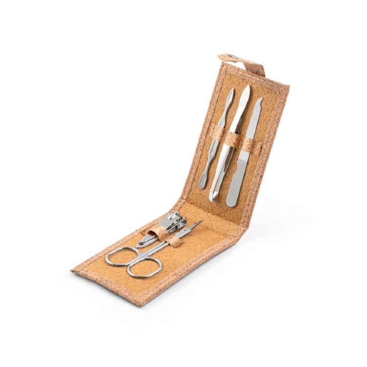 Cork manicure set with 5 stainless steel pieces: nail file, scissors, nail clipper, tweezers and a double ended cuticle pusher. Supplied in a natural paper pouch. As the product is made from natural materials, the colour and the printing result may vary between products. Product in neutral color