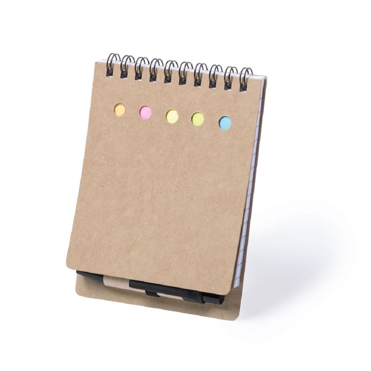 Sticky ring notepad with recycled cardboard ball pen included. With soft-touch covers in resistant rigid recycled cardboard with die-cut. With 50-sheet single-stripe book, 15 large sticky notes and 75 mini sticky notes. Ball pen with blue ink. (neutral color)