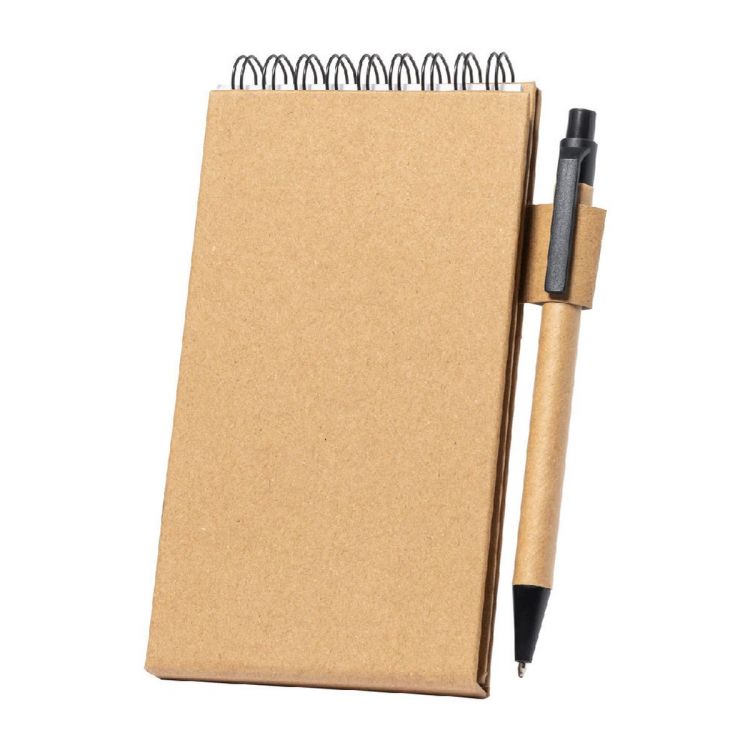 Recycled paper covered spiral notepad with 30 lined sheets, 25 sticky notes and 125 page markers (in 5 different colours). With mobile phone holder function. Including recycled paper ballpoint pen with blue refill