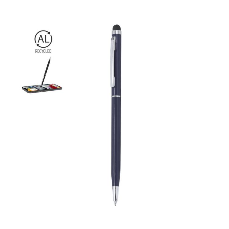 Elegant stylus pen made from Recycled Aluminum. With a rotating mechanism with a glossy finish and a black tip on the top, in blue ink. Clip and accessories in chrome finish. With an engraved Recycled Aluminum logo.Recycled Aluminum is a material with almost infinite recycling possibilities, without losing its original properties and consuming less energy in this process.GRS certification (Global Recycled Standard), which guarantees the recycled origin of the material used to manufacture the product.