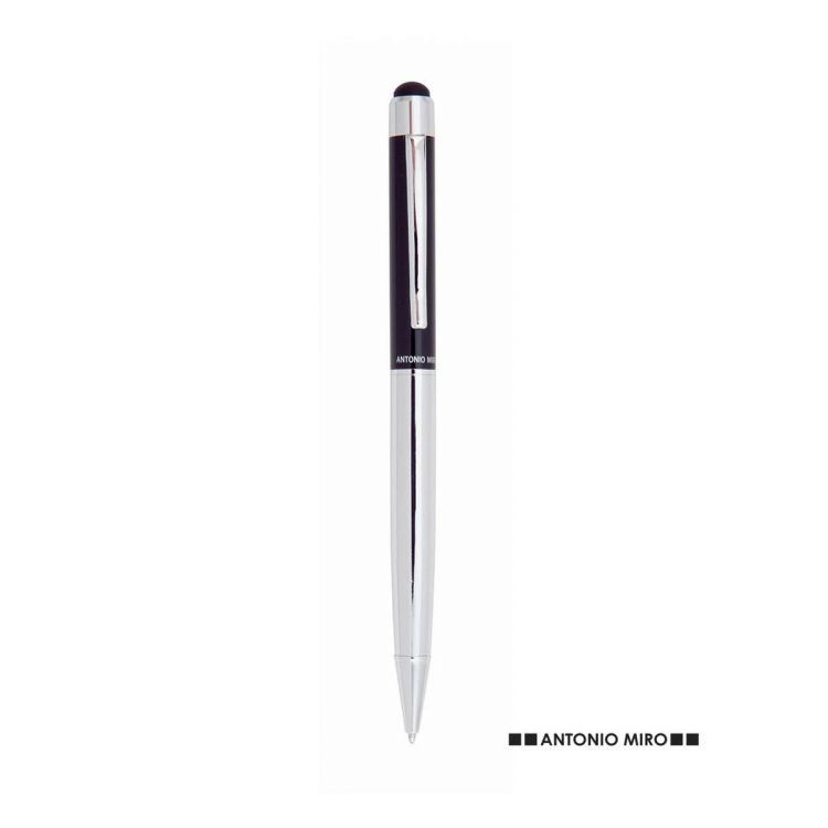 Pointer ball pen by Antonio Miró with twist mechanism and soft metal body, elegant combination of colors in silver and black. Clip and design tip in matching color. Presented in an individual black box with the brand logo. Blue ink. (black color)