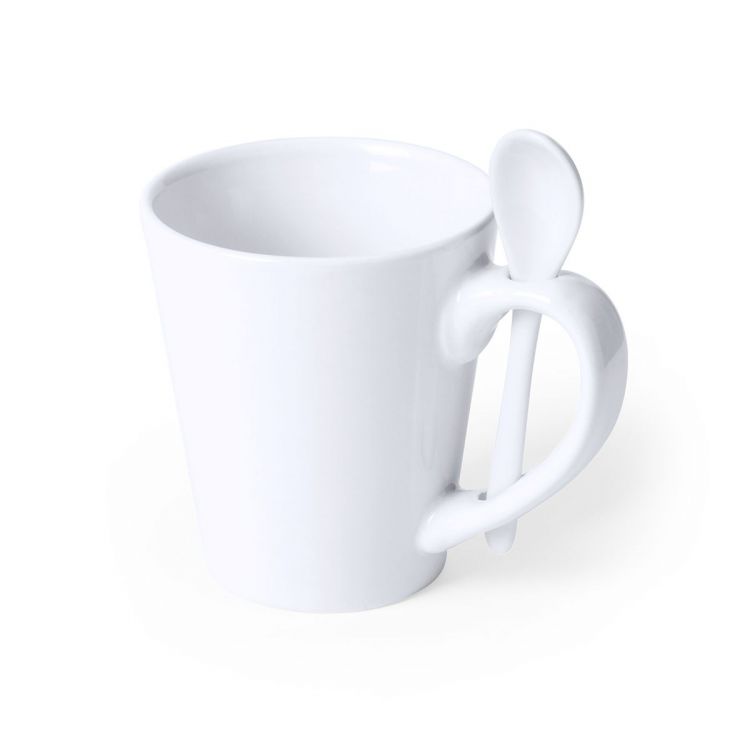 350ml ceramic mug in white color and with built-in ceramic spoon in the handle. Especially designed for sublimation printing and presented in an individual box.Instruction manual available in Spanish and English. (white color)