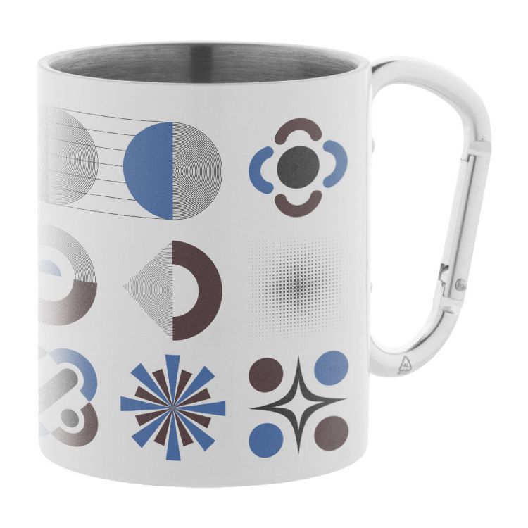 Double-wall, recycled stainless steel sublimation thermo mug with recycled aluminium carabiner handle. 300 ml. In kraft paper box, in white color