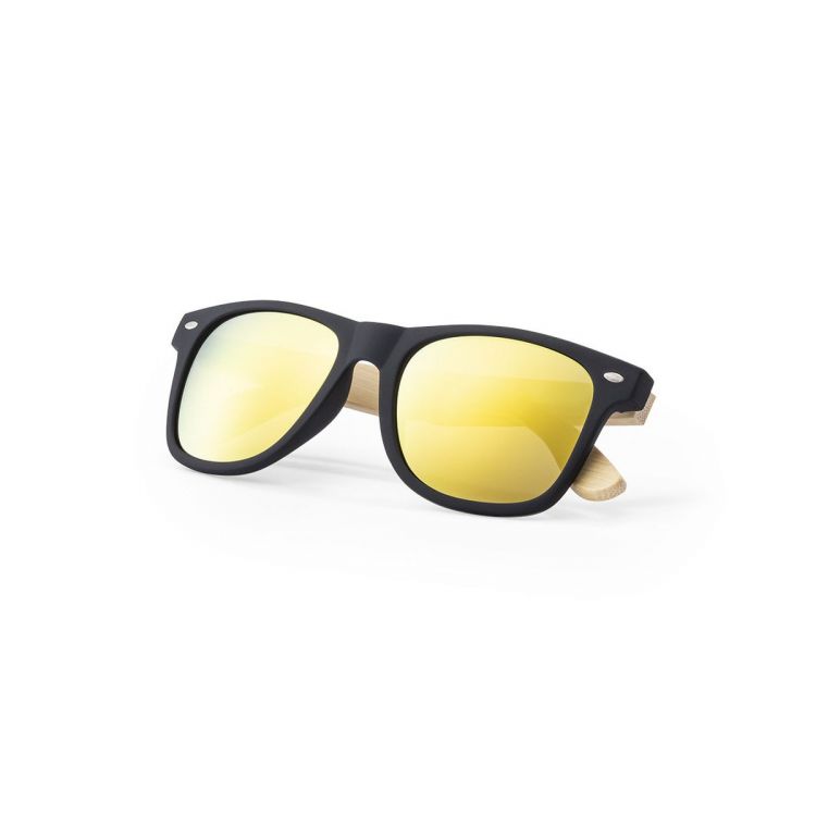 Nature line sunglasses with UV400 protection. Black frame in durable PC material and arms in bamboo. AC (cellulose acetate) lenses with mirror finish, available in a wide range of colours. Presented in attractive eco design box.