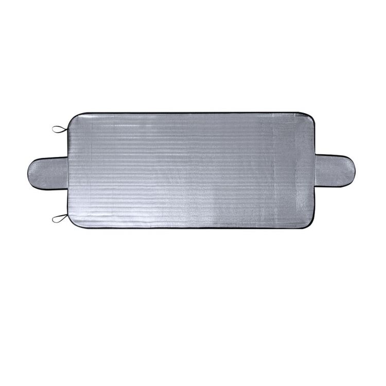 Durable single-sided Aluminium sunshade, designed to be positioned on the outside of the front window and as protection against adverse weather conditions like snow.. Including two side flaps to fit between the frame and the vehicle doors, providing additional insulation to the front window. Roll-up and with elastic bands for an easy storage, and presented in an individual recycled bag. (neutral color)