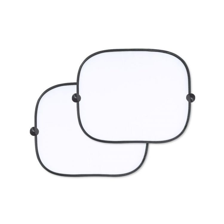 A set of 2 foldable sunshades for car windows, made from durable polyester. Lightweight and measuring 44 x 36 cm each, with reinforced edges and attachment via suction cups (4 units included). Comes with a simple folding system and an individual matching cover. Special white color for sublimation.