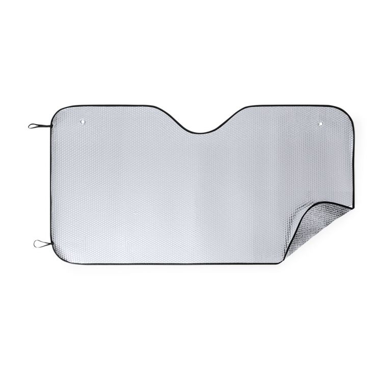 Sunshade in aluminum with bubble on both sides in silver metallic finish with black piping. Maxi 143x74cm in size, with metal reinforcement rings, elastic straps for folding, two suction cups for adjustment and presentation unfolded for easy printing. (neutral color)