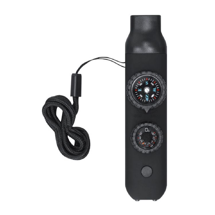 Survival whistle made of resistant ABS with a rubbery finish. It integrates 6 essential functions:- Compass of 2.55 cm in diameter, with indications of North, South, East and West.- High power whistle, ideal for emitting emergency signals.- Thermometer with temperature range from -20 ºC to 50 ºC.- Magnifying glass of 2 cm in diameter, perfect for observing small details or even for lighting fires by concentrating sunlight.- Mirror, Built-in at the bottom of the compass.- Flashlight with 2 LEDs and on/off button at the top.Includes a practical cord for easy transport, ideal for comfortably hanging around the neck. (black color)