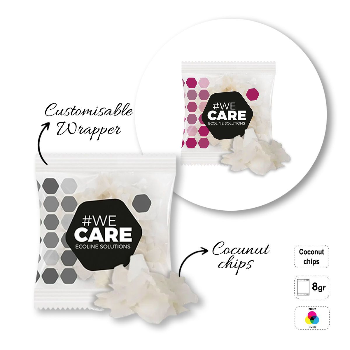 Bag of fruit chips. The letters in the product code correspond to the type of chips: A- coconut chips (8 g), B- banana chips (8 g). Packaging: 100% compostable food bag (white or transparent finish to be chosen when ordering) completely customizable. Minimum shelf life - 6 months.