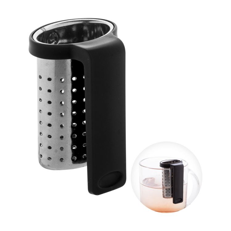 Stainless steel tea infuser with practical clip holder in recycled ABS. Designed to easily attach to the rim of a mug.