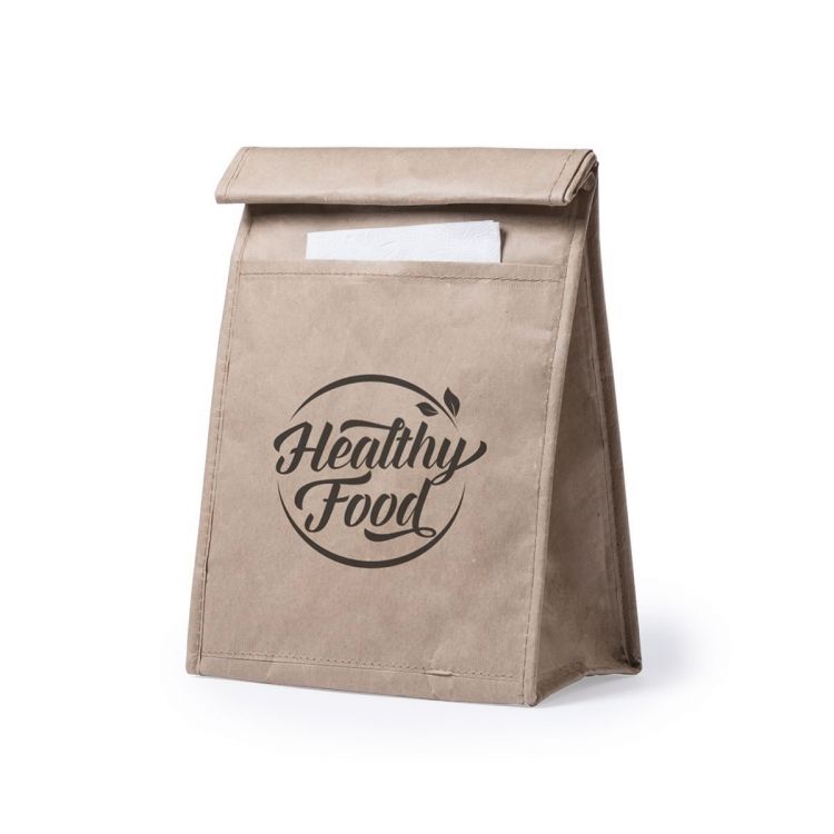 Thermal bag in moist resistant paper of 85g/m2. Isothermal inside in aluminum finishing, with outside pocket and velcro closure. 2.3 liters capacity. (neutral color)