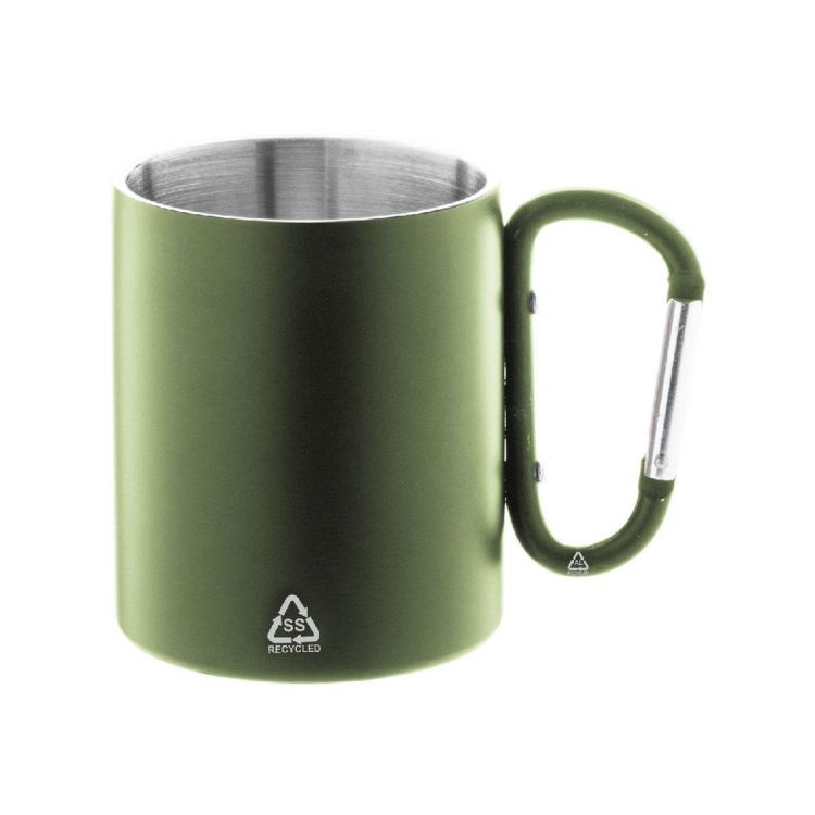 Double-wall, recycled stainless steel thermo mug with matching colour recycled aluminium carabiner handle. 300 ml. In kraft paper box.