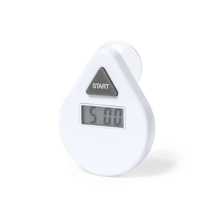 Timer made in resistant ABS, with white finish and suction cup fixing. Easy-to-read LCD display, with countdown control button (5 minutes). Battery powered (button cell included). Presented in an individual kraft design box, with instruction manual in English and Spanish. (white color)