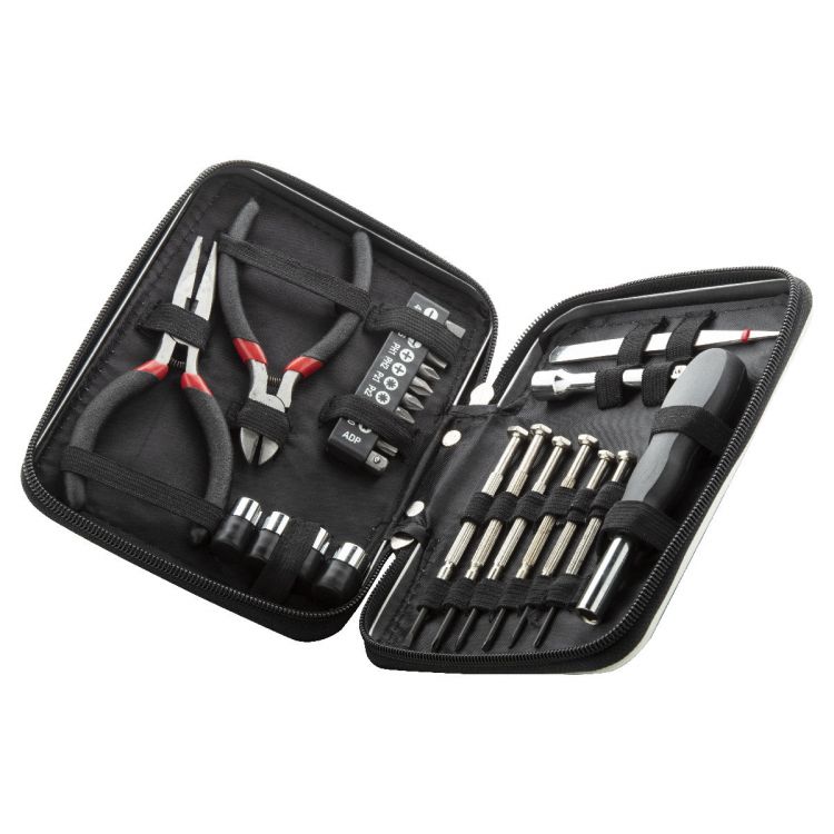 25 pc metal tool set in zipped aluminium case. Including: nose pliers, cutting pliers, socket screwdriver, extender, tweezers, 6 precision screwdrivers, 4 pc nut socket set, 10 pc screwdriver bit set