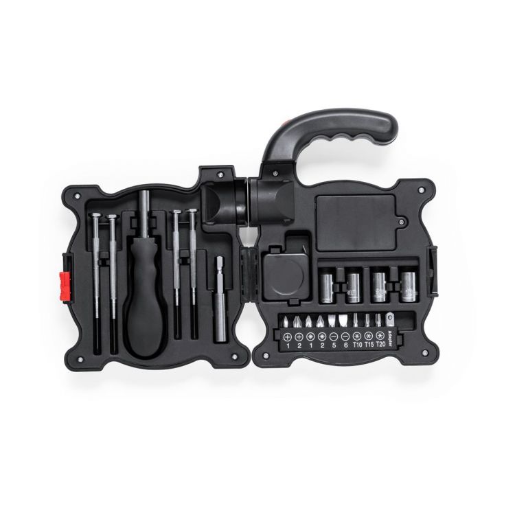 Tool set in ABS case with built-in torch and ergonomic handle, supplied with 4 LEDs powered by 3 AAA batteries (not included). It has 21 accessories inside: precision screwdrivers (flat and philips), multifunction tool handle for compatible bits (philips, flat, adapters), socket spanners and flexometer. Presented in a kraft design box. (black color)