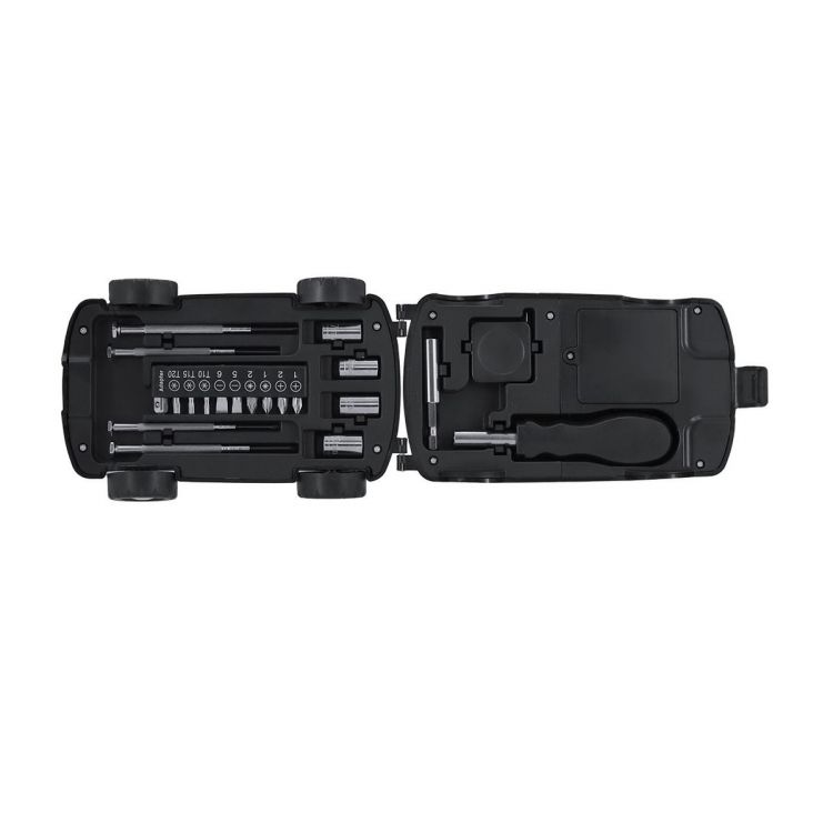 Tool set with a case shaped like a car and an LED flashlight. With 20 tools. Includes:- Precision screwdriver set (flat and Philips)- Fixing tool- Multifunction handle with flat and star screwdriver heads- Wrenches for hex nuts- Tape measureWith a flashlight with 2 integrated LEDs in the case, powered by 4 AAA batteries (not included). (black color)