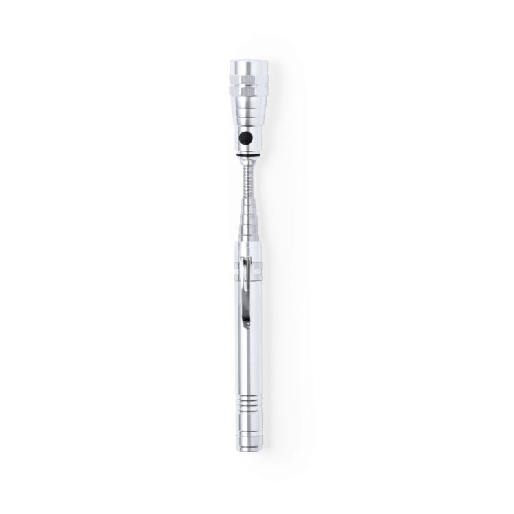Practical and versatile Aluminium torch, with extendable head (tripling its length) and flexible to reach everywhere. It is equipped with magnets to adapt to different needs and has 3 powerful LEDs for efficient illumination. Powered by button batteries -included- as well as metal clip. Individually packaged in a kraft design box. (silver color)