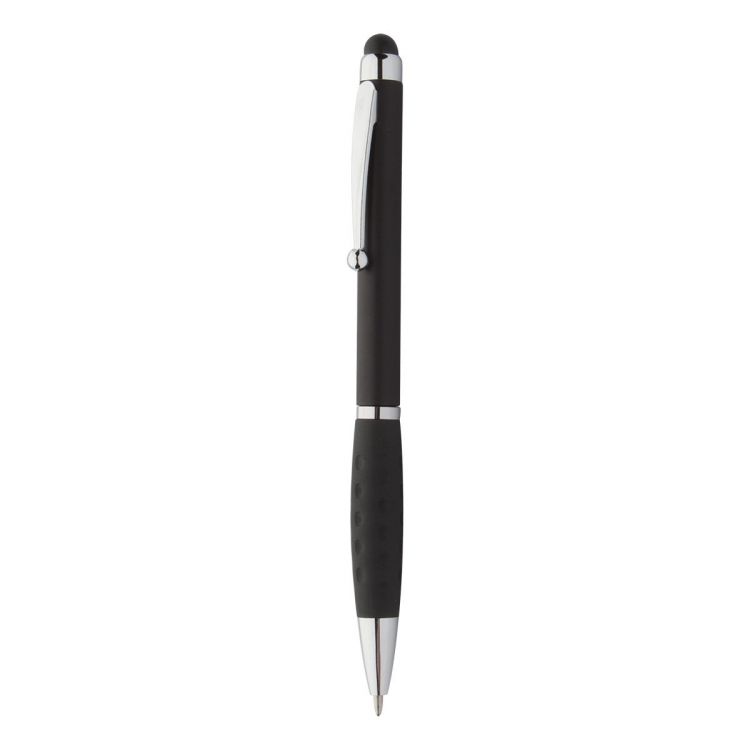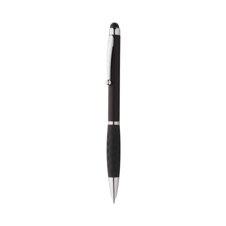 Plastic ballpoint and touch screen pen with rubber grip and blue refill.