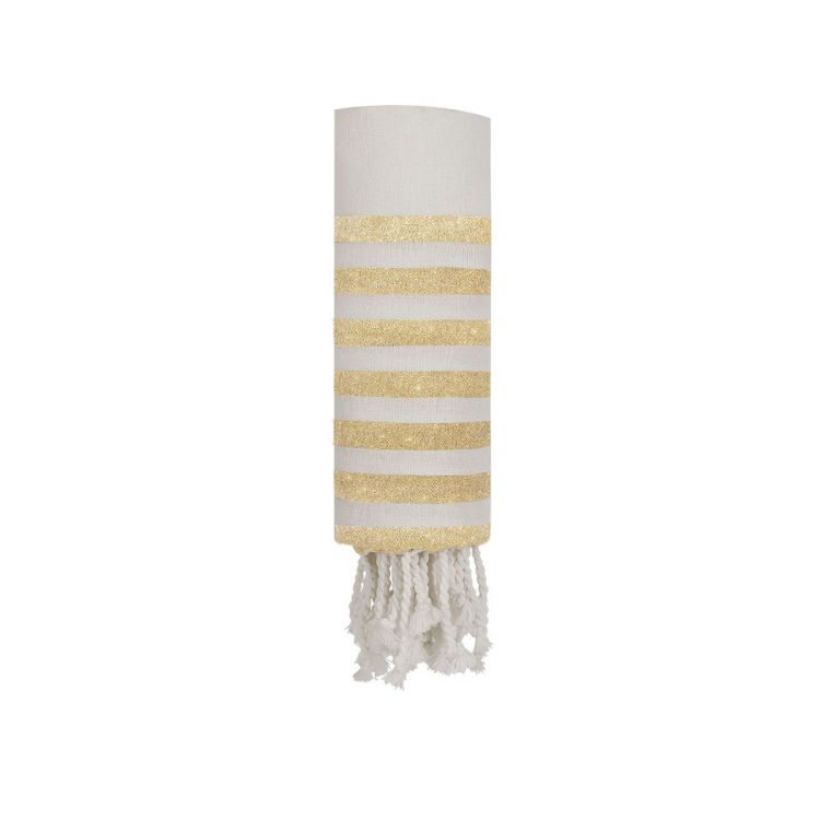 Towel Pareo made of recycled cotton of 180g/m2. White striped design combined with golden glitter stripes, solid beige ends, and distinguished cord fringes at the edges. Includes label with recycled cotton mark. (gold color)