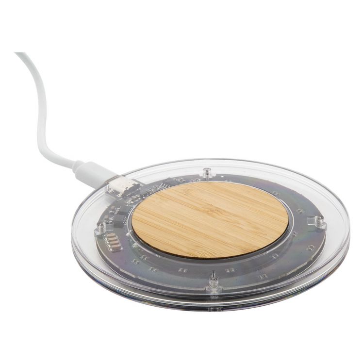 Wireless fast charger (15W) in transparent plastic and bamboo housing with visible electronic components. Including USB charger cable