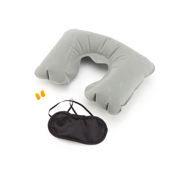 Travel set of 3 accessories presented in a soft case in bright tones. Includes a soft and comfortable black microfiber mask with matching color double elastic fit, inflatable neck cushion in velvet, and a pair of orange earplugs in comfortable EVA material.