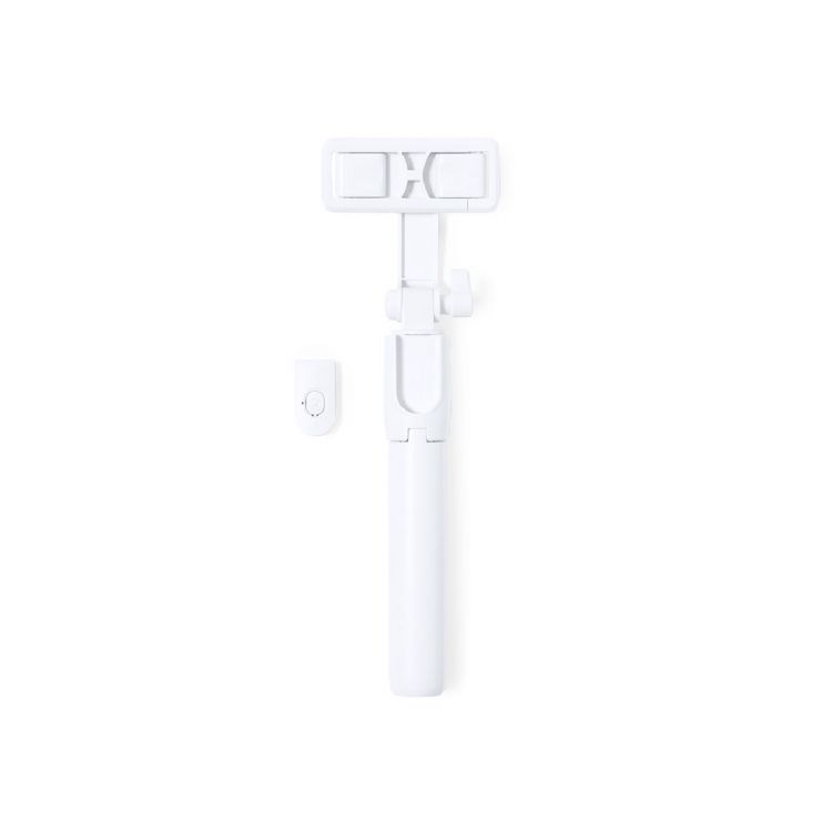 Stainless steel photo tripod for smartphones. Innovative, extensible design with up to 5 positions for capturing images from any angle. Including remote shutter button.Foldable model, compact in size and ergonomic design, for easy transport and non-slip surface to easily hold the selfie stick.Presented in a kraft design box. Instruction manual available in English and Spanish. (white color)