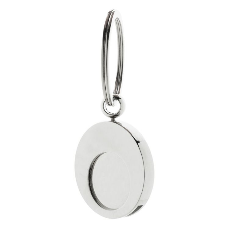 Round shaped metal keyring with shopping trolley coin. In kraft paper box