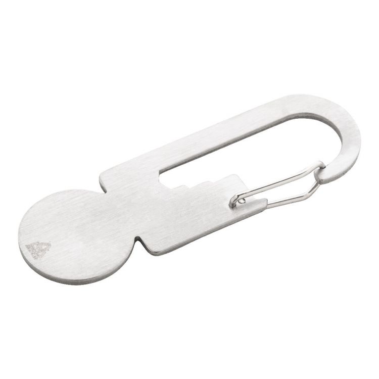 Recycled stainless steel multi tool with carabiner, shopping trolley coin, ruler and 3 flat wrenches