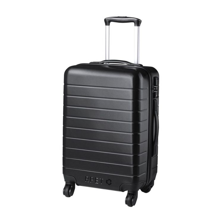 Impact-resistant, nature line, cabin trolley made of RPET material produced from recycled plastic, thus promoting the reuse of plastic waste and contributing to the sustainability of the planet. Telescopic carrying handle, with 4 swivel wheels and TSA security lock. RPET inner lining, with elastic fastening straps included. RPET emblem engraved at front.