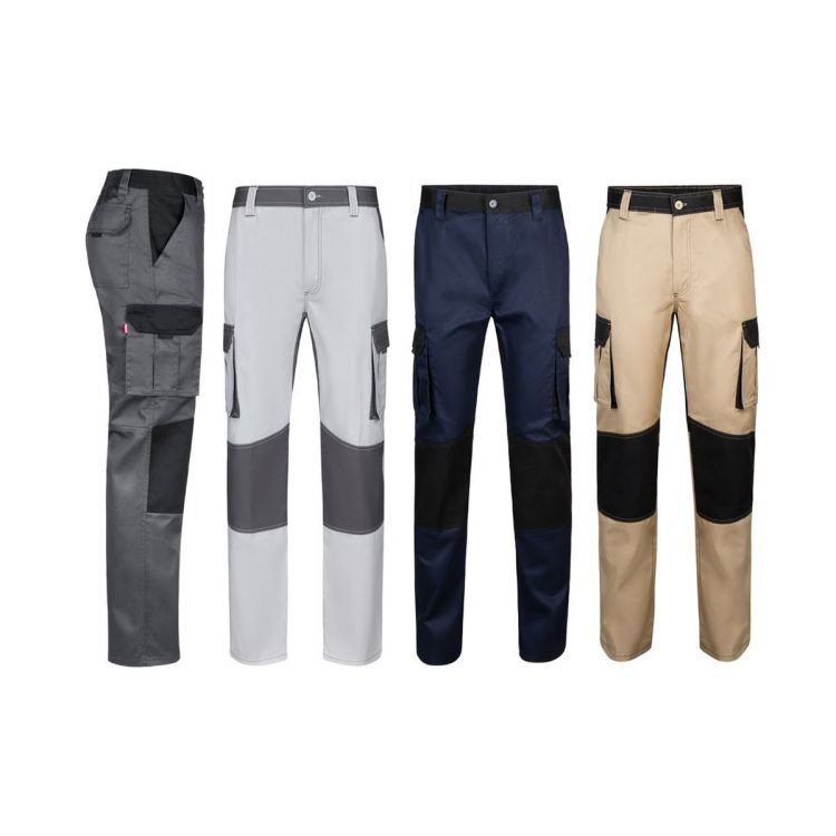 Two-tone multi-pocket twill trousers (240 g/m²), in cotton (35%) and polyester (65%). Slim Fit cut, elasticated waistband and fabric reinforcement on the knees and back. Contains six pockets (2 French pockets, 2 side gusset pockets and 2 back gusset pockets)