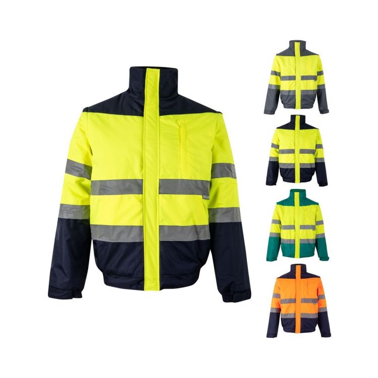 Two-tone padded jacket (180g/m²) in polyester (100%), with PU coating. With zip fastening, concealed by a placket, which closes with a hook-and-loop. Waistband and cuffs with elastic on the sides. With reflective stripes on the torso and sleeves. Hood concealed inside the collar and detachable sleeves. Contains five pockets (1 chest pocket, 2 front pockets, 1 pocket on the left arm and 1 inside pocket). Product in compliance with EU Reg. 2016/425, certified by EN20471 and class Nº 2