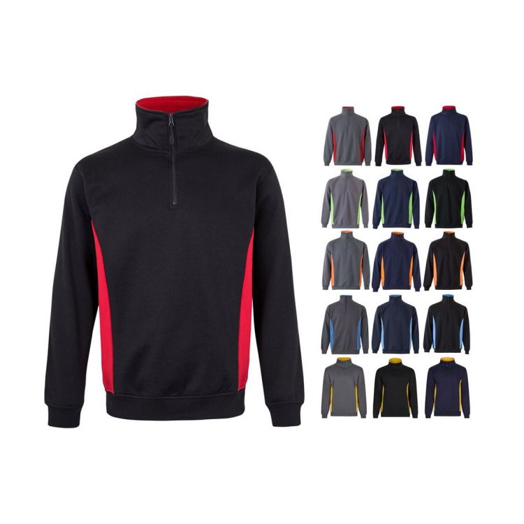 Two-tone fleece sweatshirt (260g/m²), in polyester (65%) and cotton (35%). With high collar and half zip. With ribbed cuffs and hem. Anti-pilling treatment. Sides and inside of the collar in contrasting color