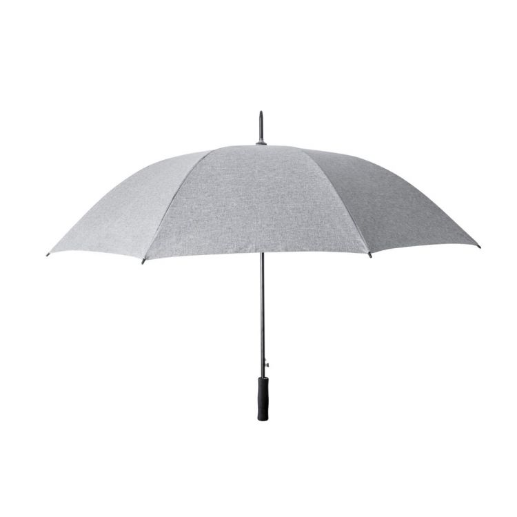 High quality 130cm diameter umbrella. Made of durable 150D polyester material and in an elegant marbled grey tone. Automatic opening and fibreglass ribs, with windproof system and velcro closure. With ergonomic handle in soft EVA and presented in a recycled bag. (grey color)