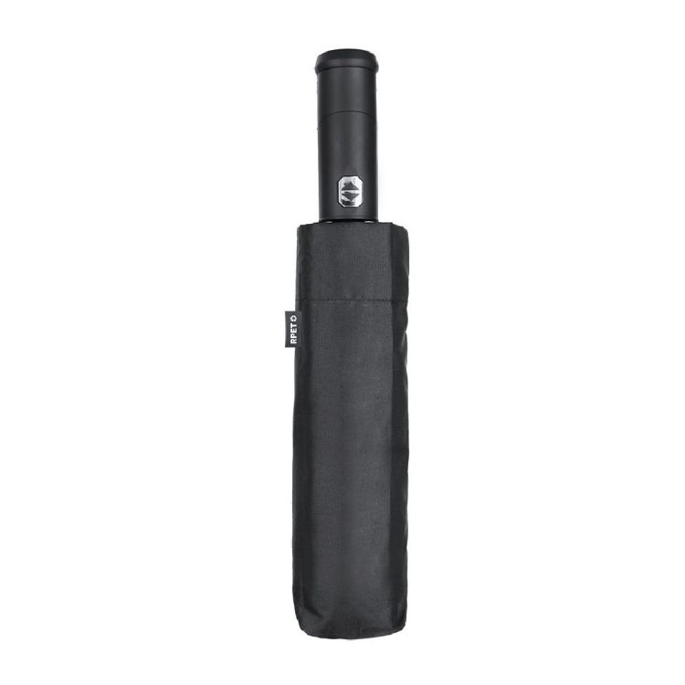 Umbrella made of RPET. With a practical 180º turning lantern handle in soft touch rubber and ON/OFF button. 105cm diameter, in 190T RPET pongee material. Automatic opening and closing, with windproof mechanism and fibreglass ribs. Label with RPET logo. Battery power supply (cell batteries included).RPET material is made from recycled plastic, thus promoting the reuse of plastic waste and helping the sustainability of the planet. (black color)