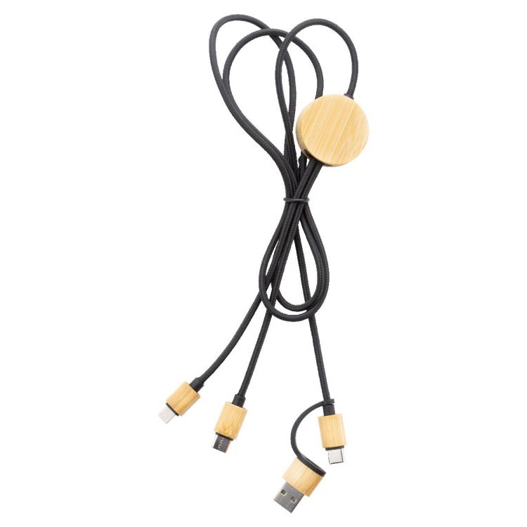 RPET and bamboo USB charger cable with micro USB, USB-C and Lightning connectors. With USB and USB-C inputs. Cable length: 100 cm